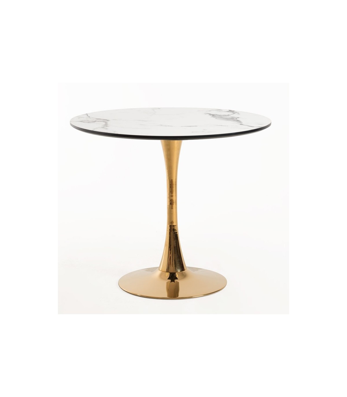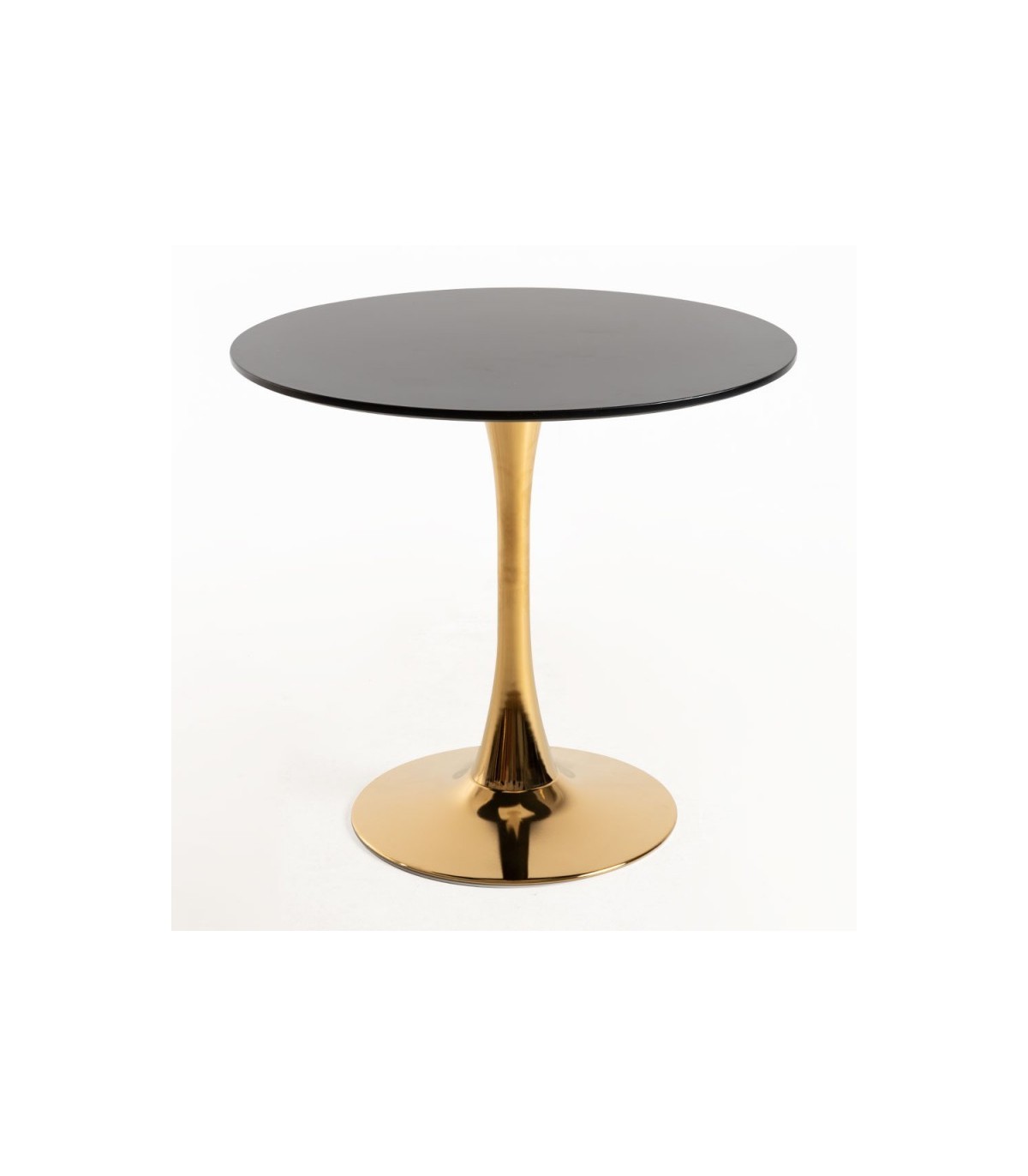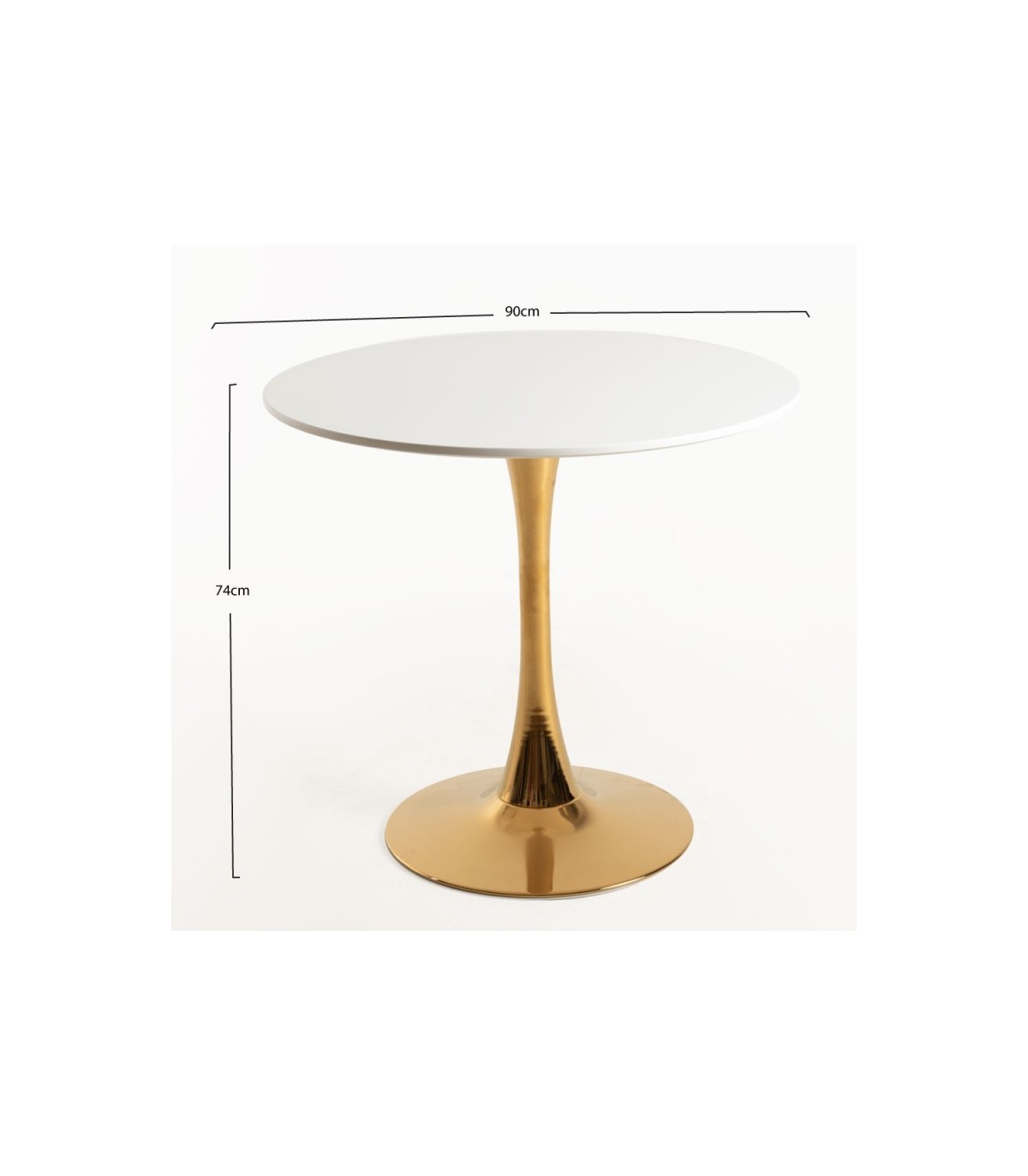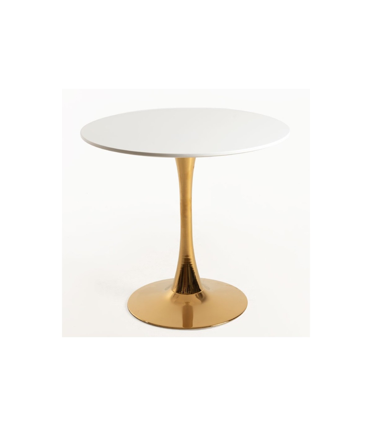 Mesa Kalando Golden de estilo ecléctico, el armazón interior metálico lacado en oro forrado de polipropileno y tablero mdf lacado blanco, también hay en negro. Altura de 74 cm, diámetro varias medidas.