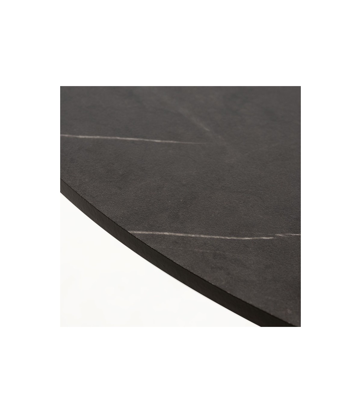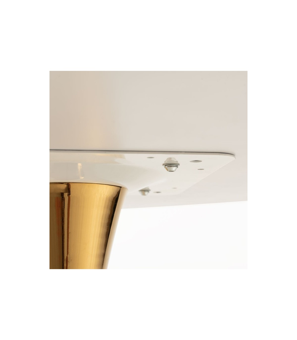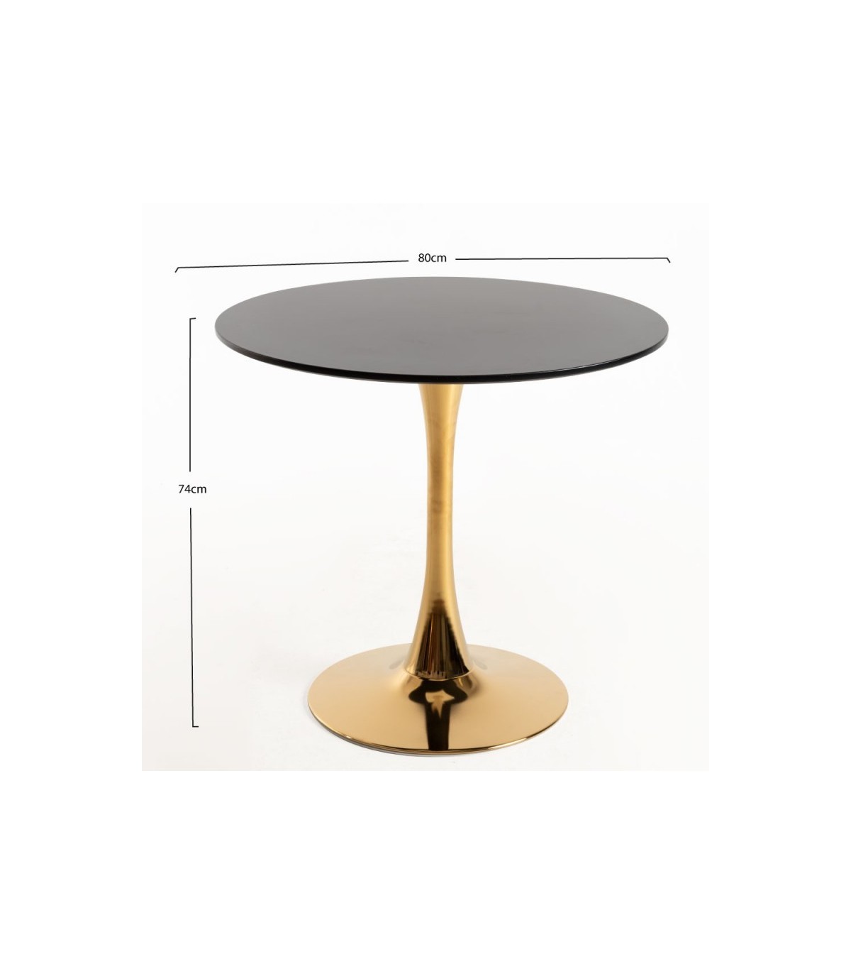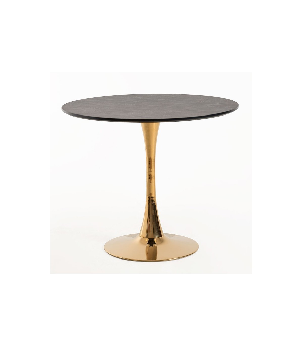 Mesa Kalando Golden de estilo ecléctico, el armazón interior metálico lacado en oro forrado de polipropileno y tablero mdf lacado blanco, también hay en negro. Altura de 74 cm, diámetro varias medidas.