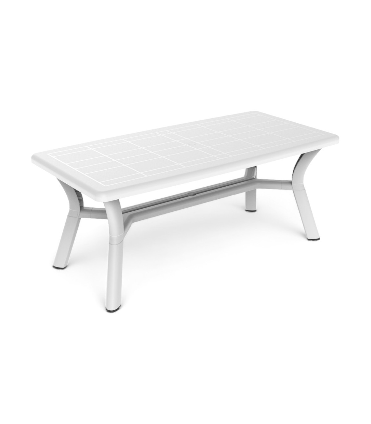 • Mesa inyectada en polipropileno con patas enlazadas para mayorestabilidad. Agujero parasol 38 mm. Tacos regulables y antideslizantes.