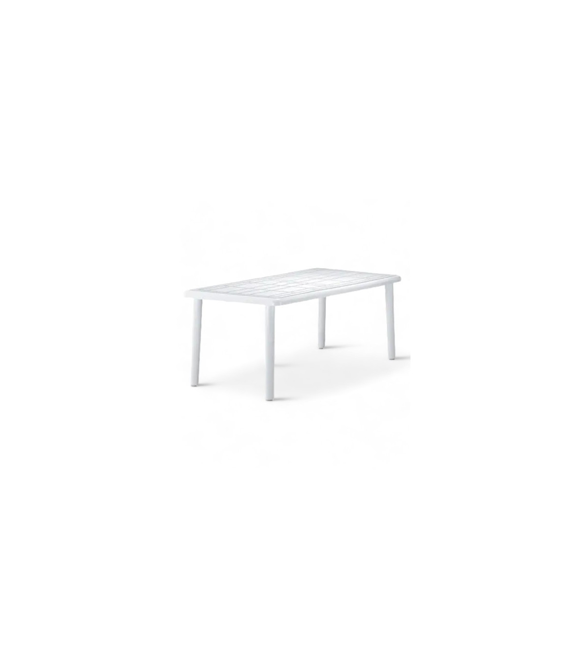 Mesa rectangular inyectada en polipropileno. Patas embutidas. Agujero para parasol de 38 mm. Peso 9.4 kgs