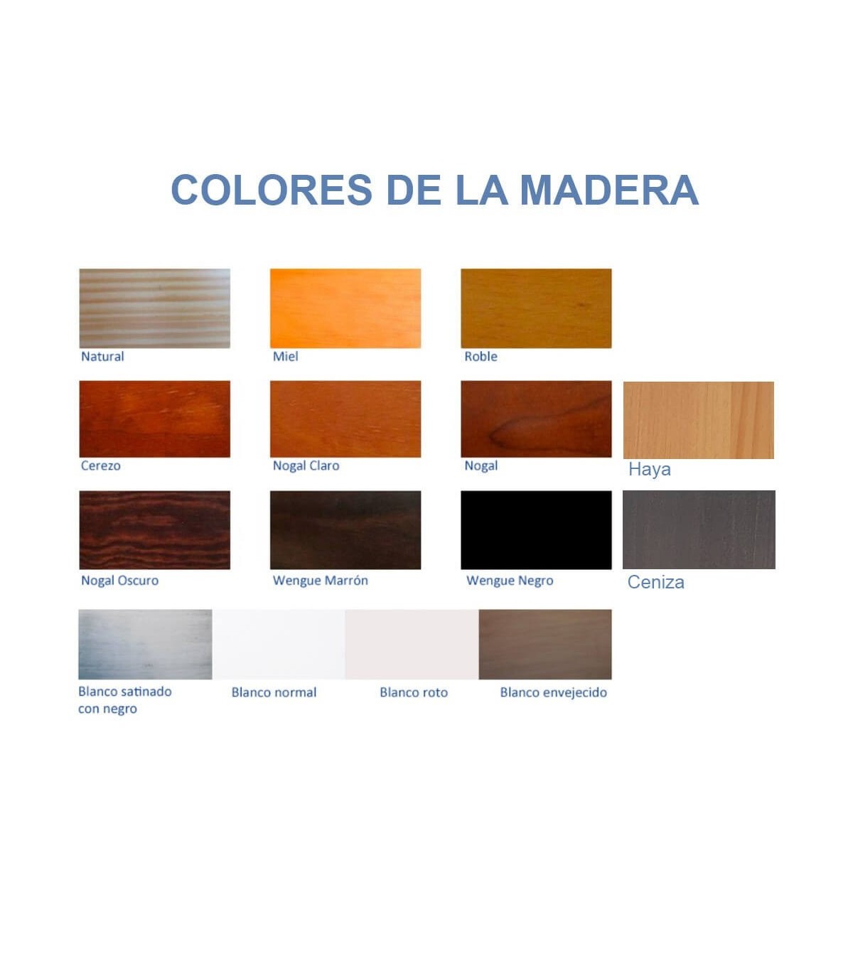 Los colores disponibles son: natural, miel, roble, cerezo, nogal claro, nogal, nogal oscuro, wengue marrón, wengue negro, blanco, blanco envejecido, blanco patinado con negro y blanco roto.