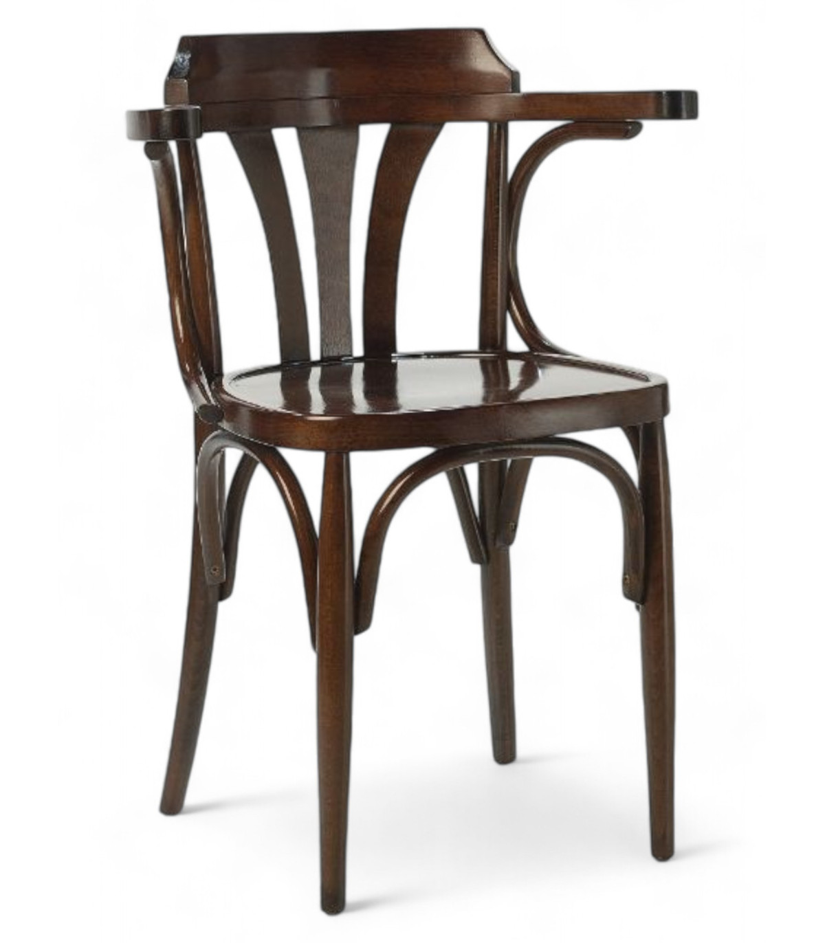 Sillón Quen fabricado en madera de haya barnizada en color nogal oscuro, se puede barnizar en mas colores, pregunten al comercial. Icono del diseño de madera curvada. Destaca por su elegancia y delicadas curvas. Mobiliario Hostelería, Sillón solo para uso interior. Sillón madera para hostelería moderno y resistente.