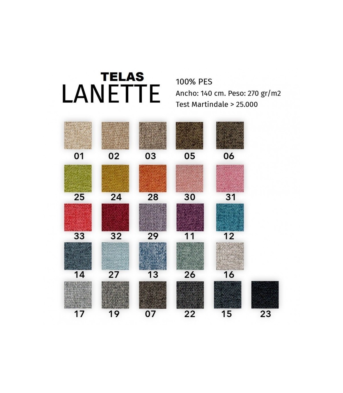 Los colores disponibles son: natural, miel, roble, cerezo, nogal claro, nogal, nogal oscuro, wengue marrón, wengue negro, ceniza, haya, blanco, blanco envejecido, blanco patinado con negro y blanco roto.