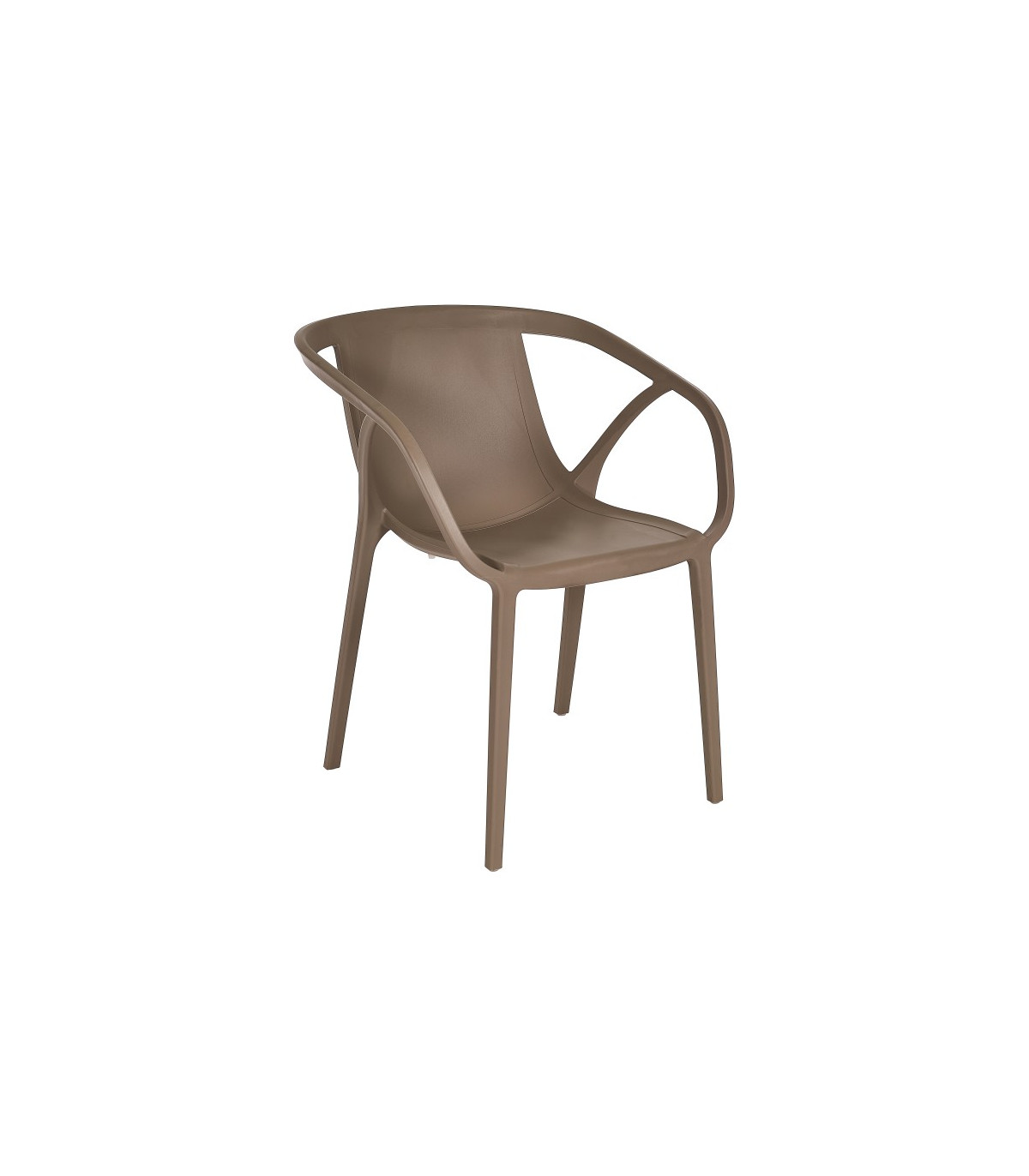 Silla con brazos apilable para uso exterior e interior. Polipropileno reforzado con fibra de vidrio. Inyección por gas. Tacos antideslizantes. 100% reciclable.  Anti UV. Muy fácil de lavar y desinfectar. Colores antracita, taupe, tarracota y olivo.