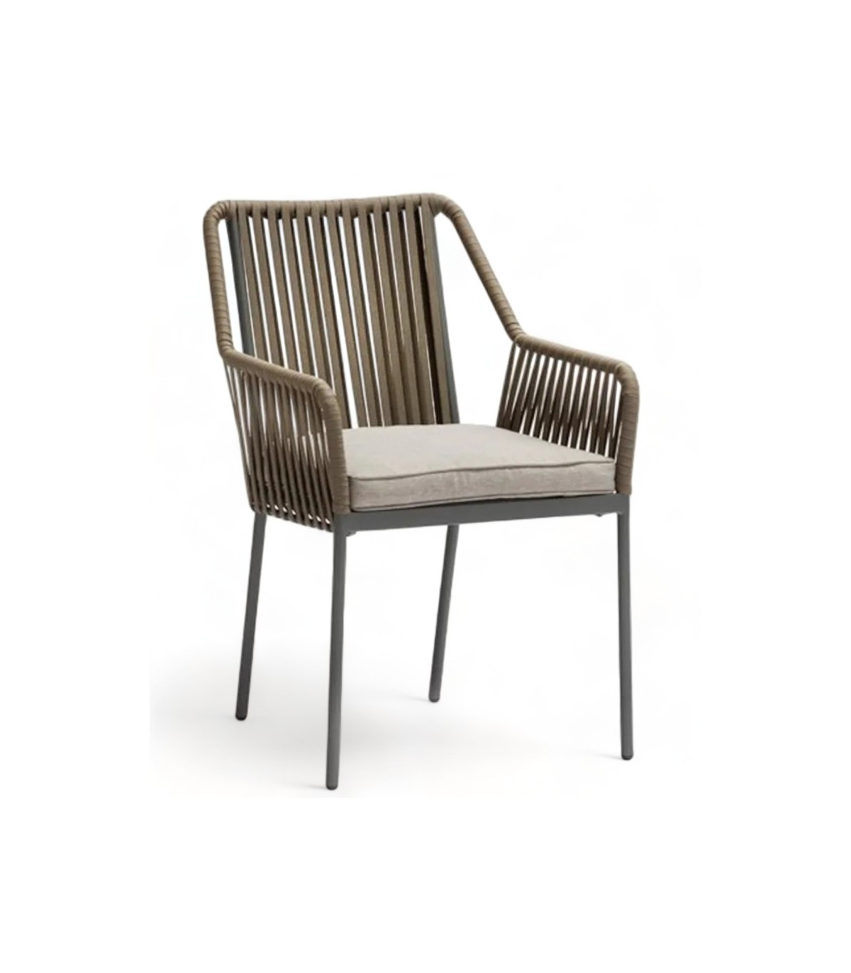 Sillón Lua estructura de aluminio color gris y asiento y respaldo tejido en cuerda de textiline color Taupe. Incluye cojines de asiento. Ligero y apilable. Diseño basado en las últimas tendencias de diseñadores de mobiliario, donde el aluminio se ha convertido en el material mejor valorado por los clientes debido a su alta calidad, resistencia y durabilidad en los ambientes climáticos más severos.