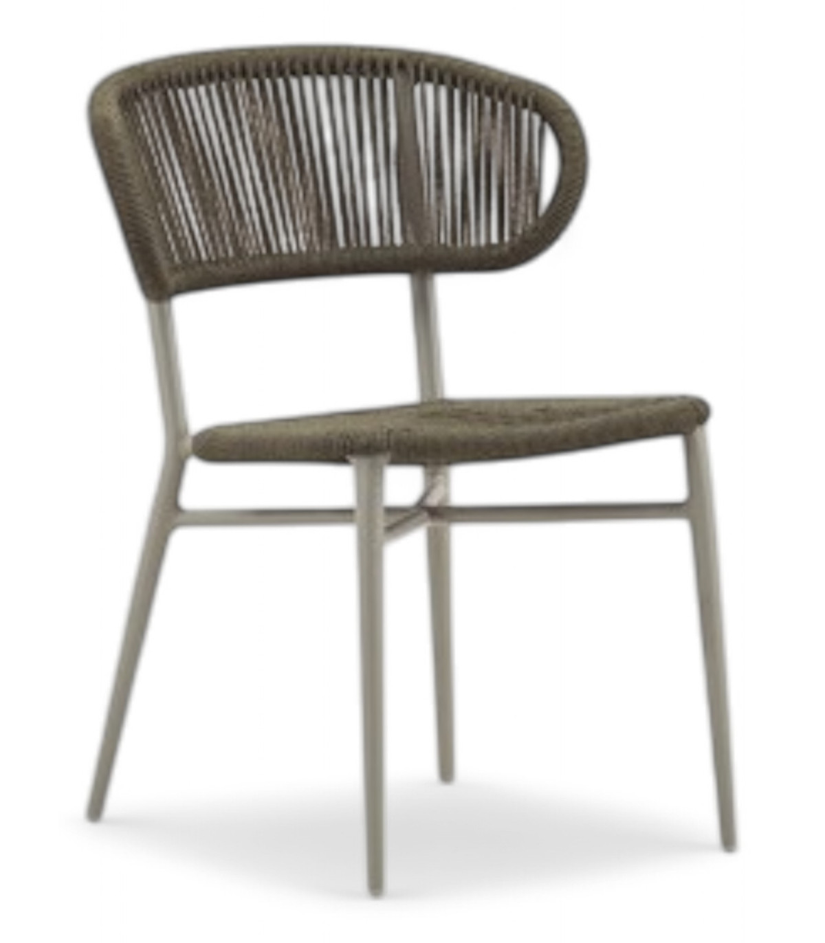 Silla Cintha gris fabricado con estructura de aluminio color gris, asiento trenzado color verde y respaldo en cuerda color verde. Apilable