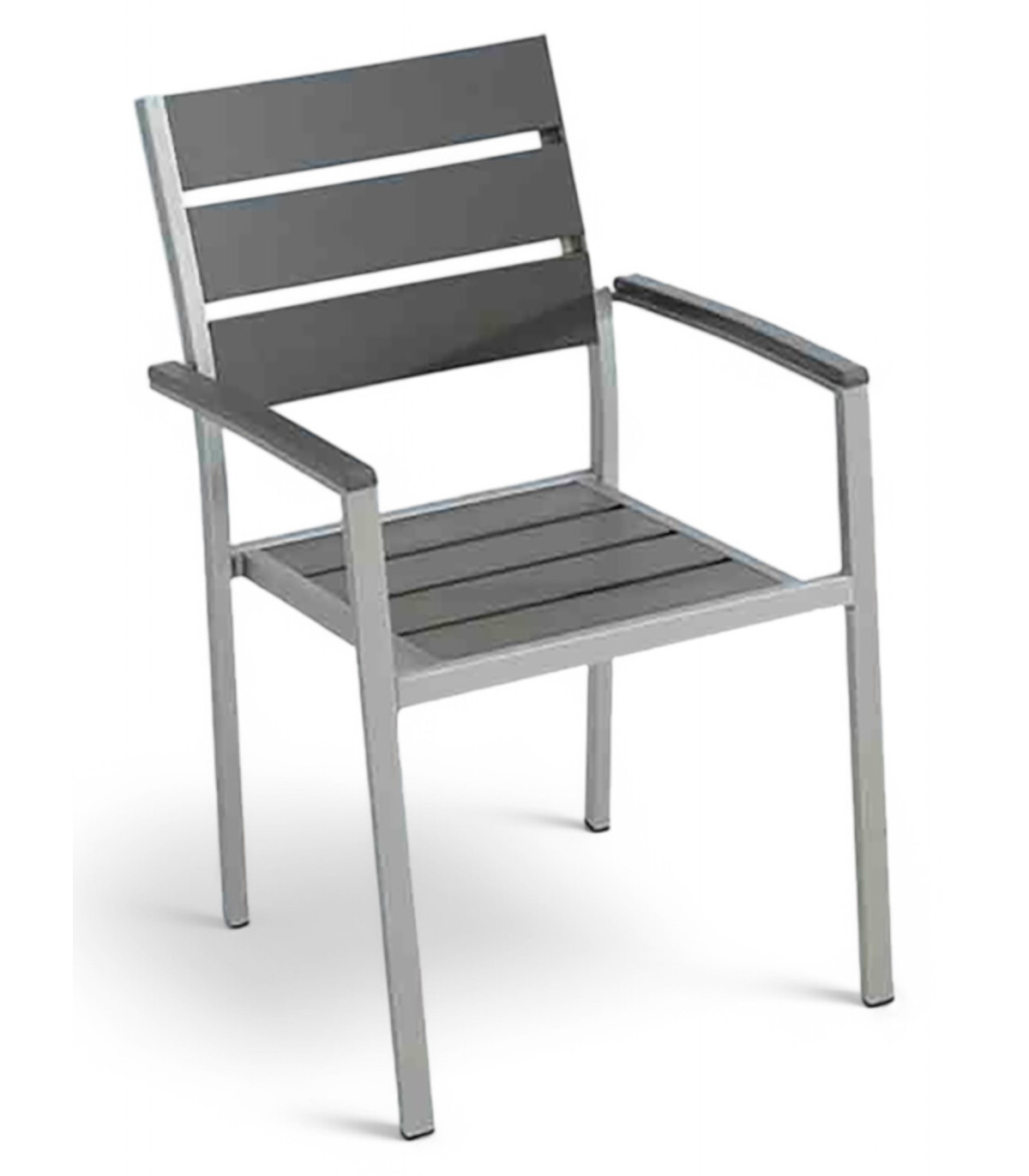 Sillón Ohio apilable clásico de estructura imitación acero inox. Lamas en poliwood imitación madera.  Indicado para uso exterior. Apilable