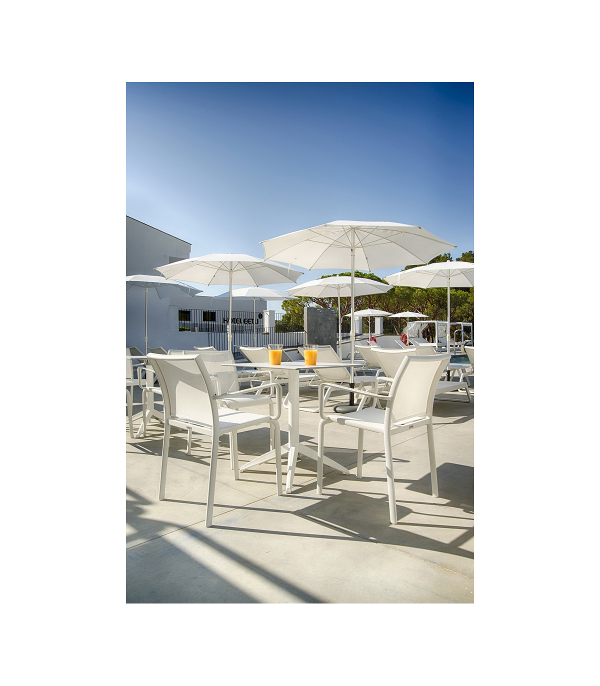 Silla con brazos apilable para uso exterior e interior. Aluminio lacado. Tejido Phifertex®. Fácil mantenimiento, antibacteriano, resistente a la humedad. Tacos antideslizantes. Muy fácil de lavar y desinfectar. Silla de uso hosteleria y hogar. Fabricada con materiales de gran calidad para ambientes elegantes.