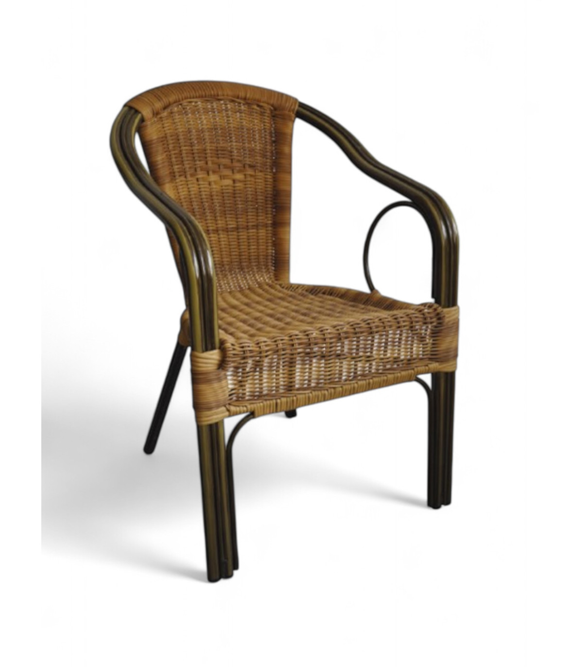Sillón con armazón de aluminio con doble tubo en color Dark Bamboo. Asiento y respaldo en tejido médula. Color rattán sintetico moka