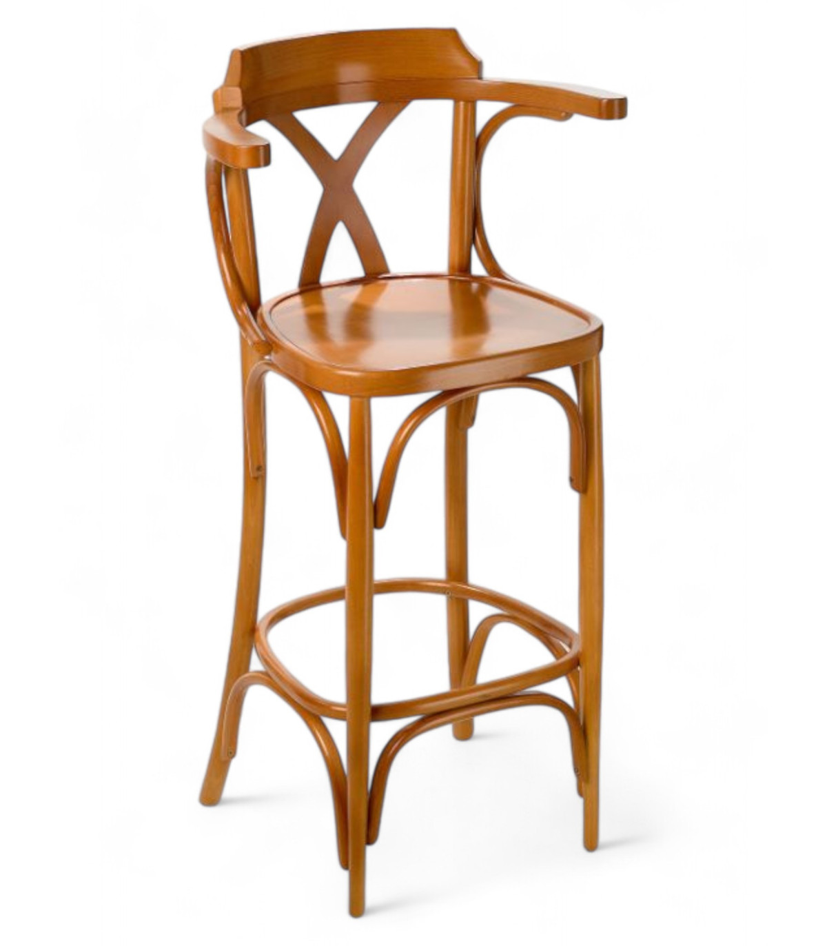 Taburete con brazos Queen fabricado en madera de haya barnizada en color nogal oscuro, se puede barnizar en mas colores, pregunten al comercial. Icono del diseño de madera curvada. Destaca por su elegancia y delicadas curvas. Mobiliario Hostelería, Sillón solo para uso interior. Taburete de madera para hostelería moderno y resistente.