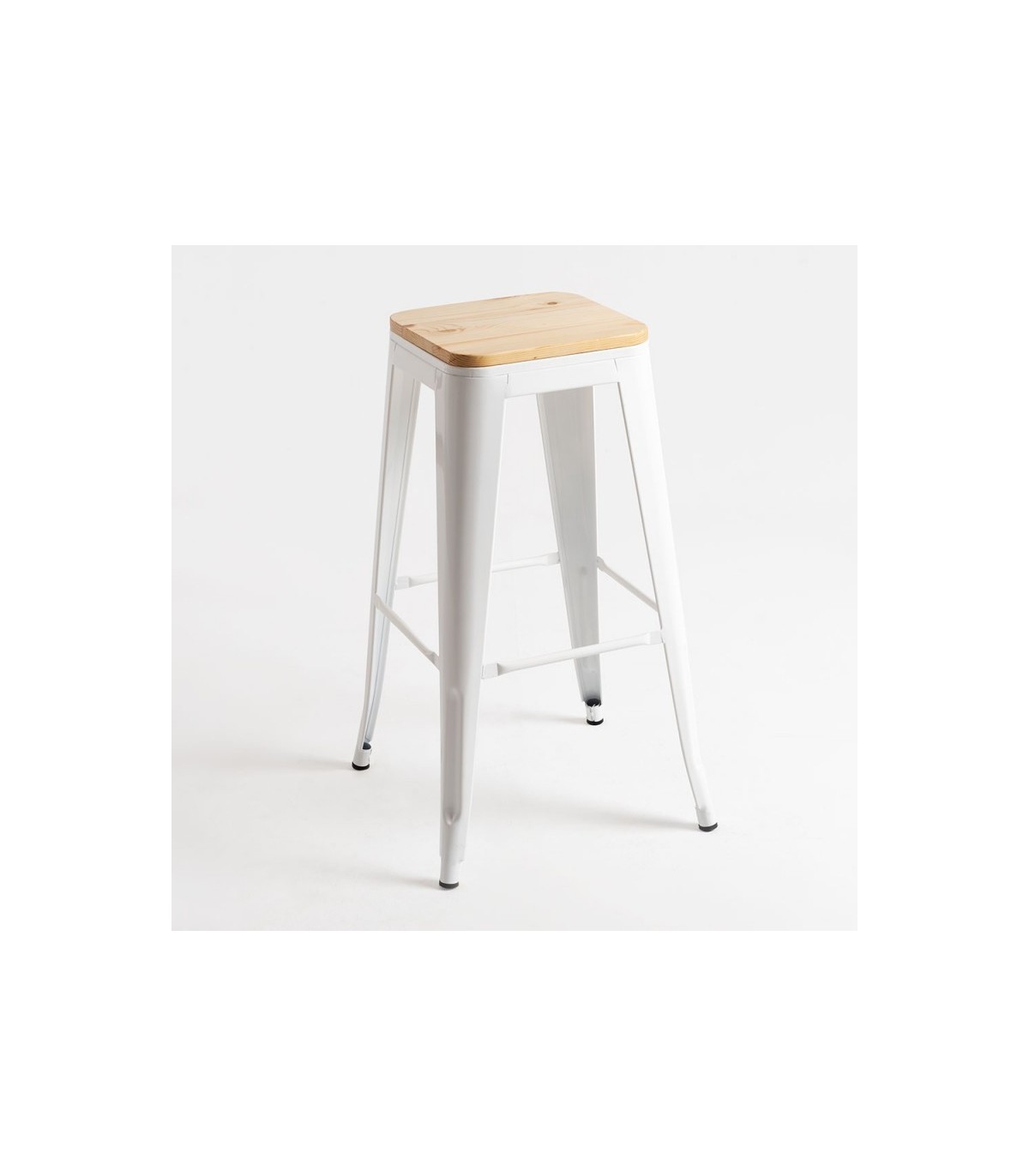 Taburete Tolix asiento madera natural de estilo vintage. Al llevar el asiento de madera impide su deslizamiento, muy importante para estar comodísimos .Con reposapiés y tacos de goma antideslizantes en las patas.Taburete apilable. Apto solo para interior, exterior bajo toldo sin que le de sol y lluvia.