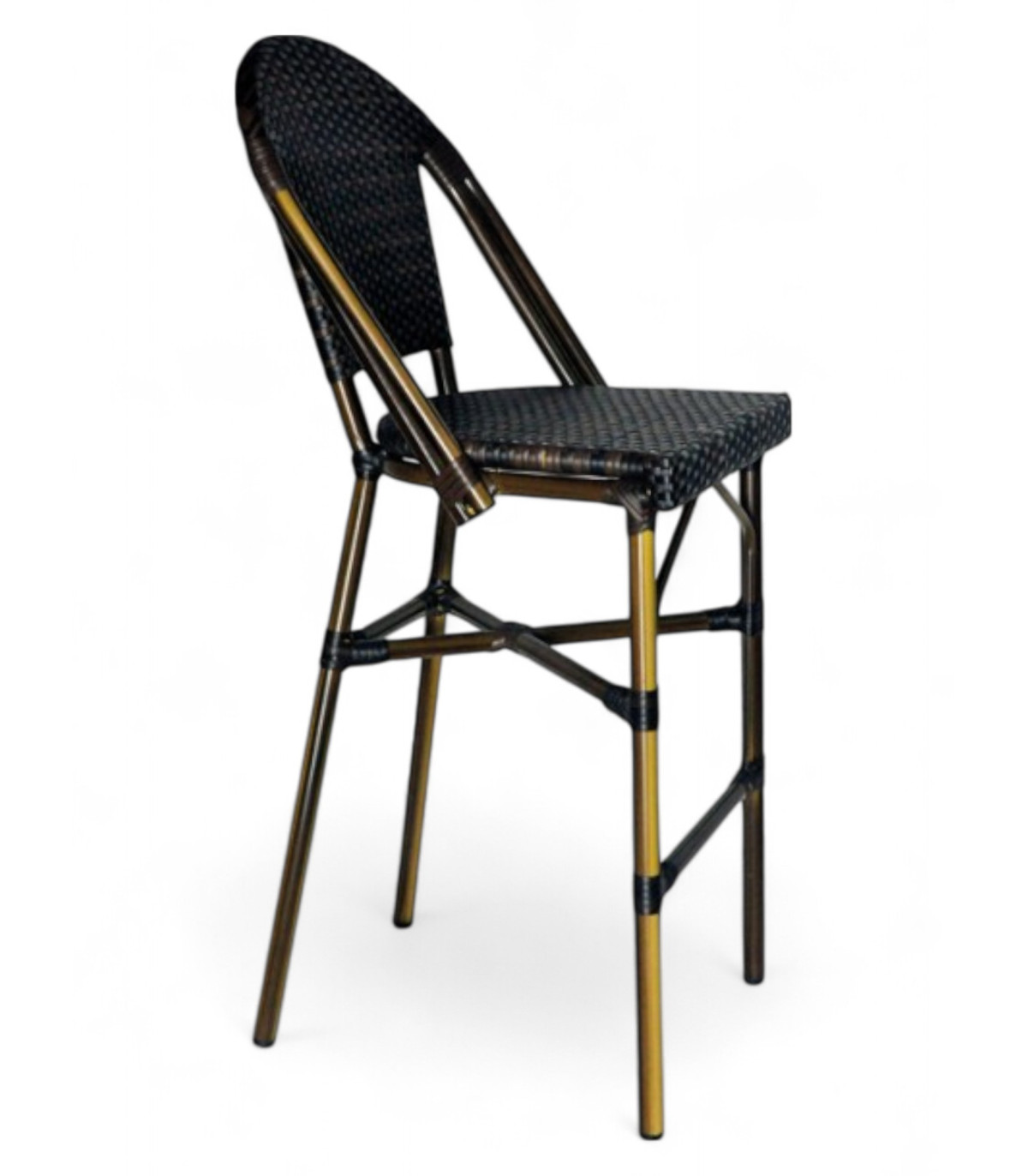 Taburete Bistró Montpellier para hostelería estructura de aluminio en color bambú oscuro junto con tejido de rattan sintético en color moka.